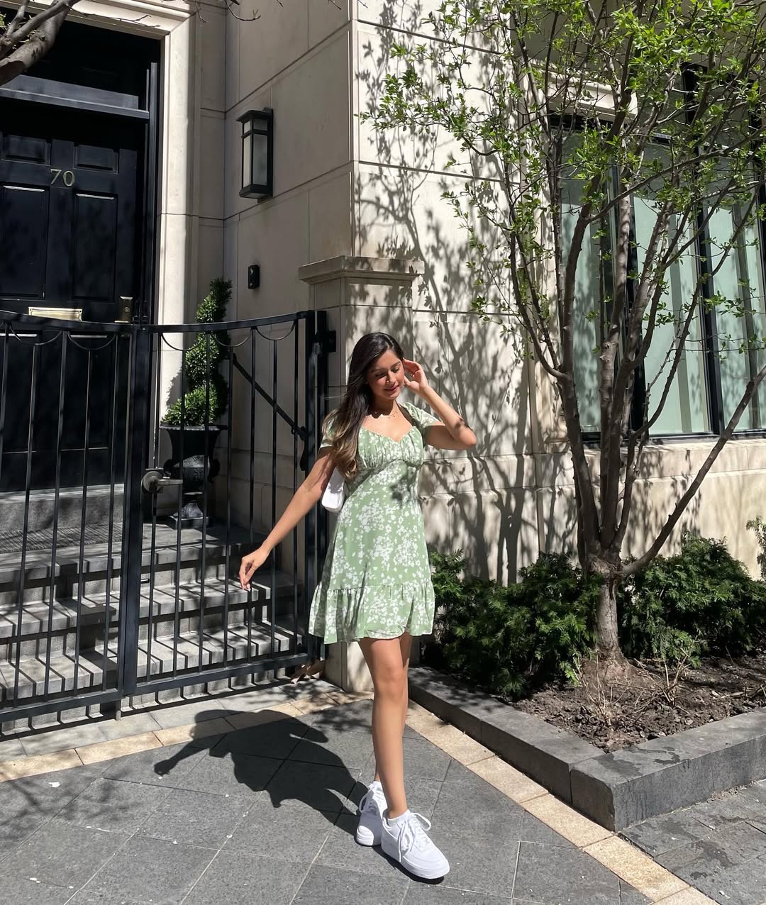 27. Sage Green Floral Mini Dress With Sweetheart Neckline And White Sneakers