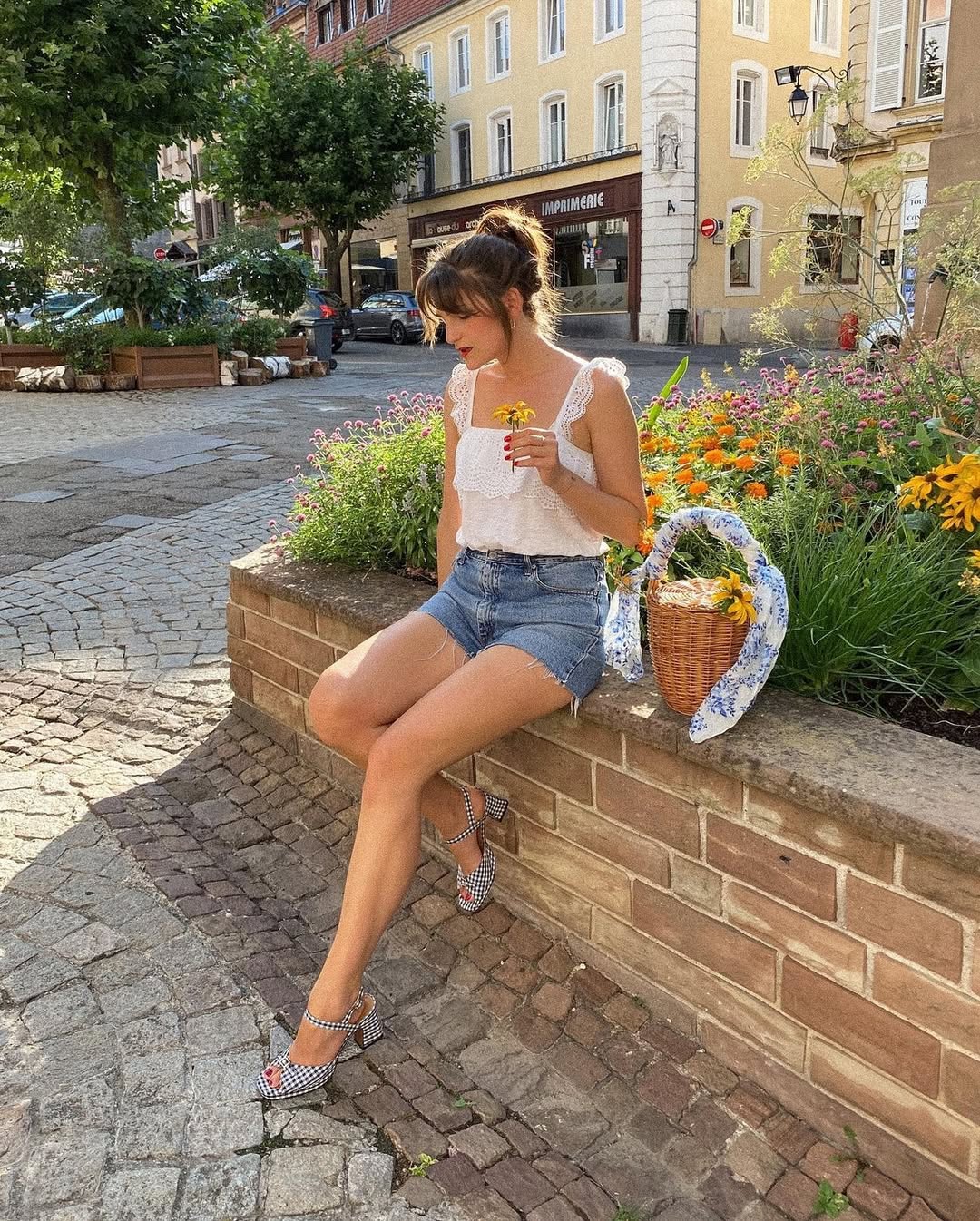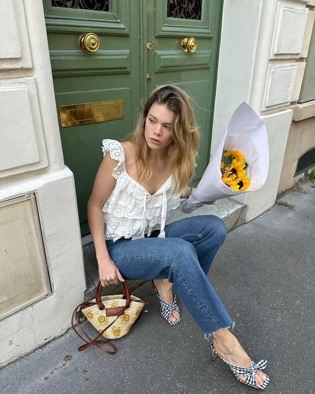 Black and white gingham bow kitten heel mules bring a playful vintage twist underfoot. A small embroidered straw basket bag with tan leather handles and sunflower detailing adds warmth and artisan charm. Holding fresh sunflowers makes this cobblestone doorstep summer look absolutely irresistible.