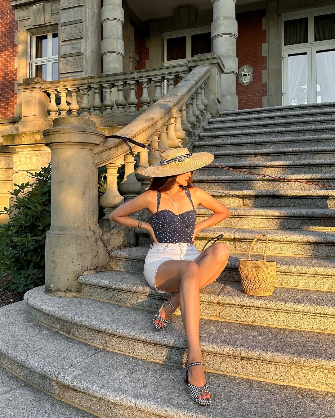 Black and white gingham block heel sandals echo the playful pattern mixing beautifully. A woven straw bucket bag and oversized canotier hat complete this dreamy, sun-kissed European manor look with timeless warm-weather elegance.