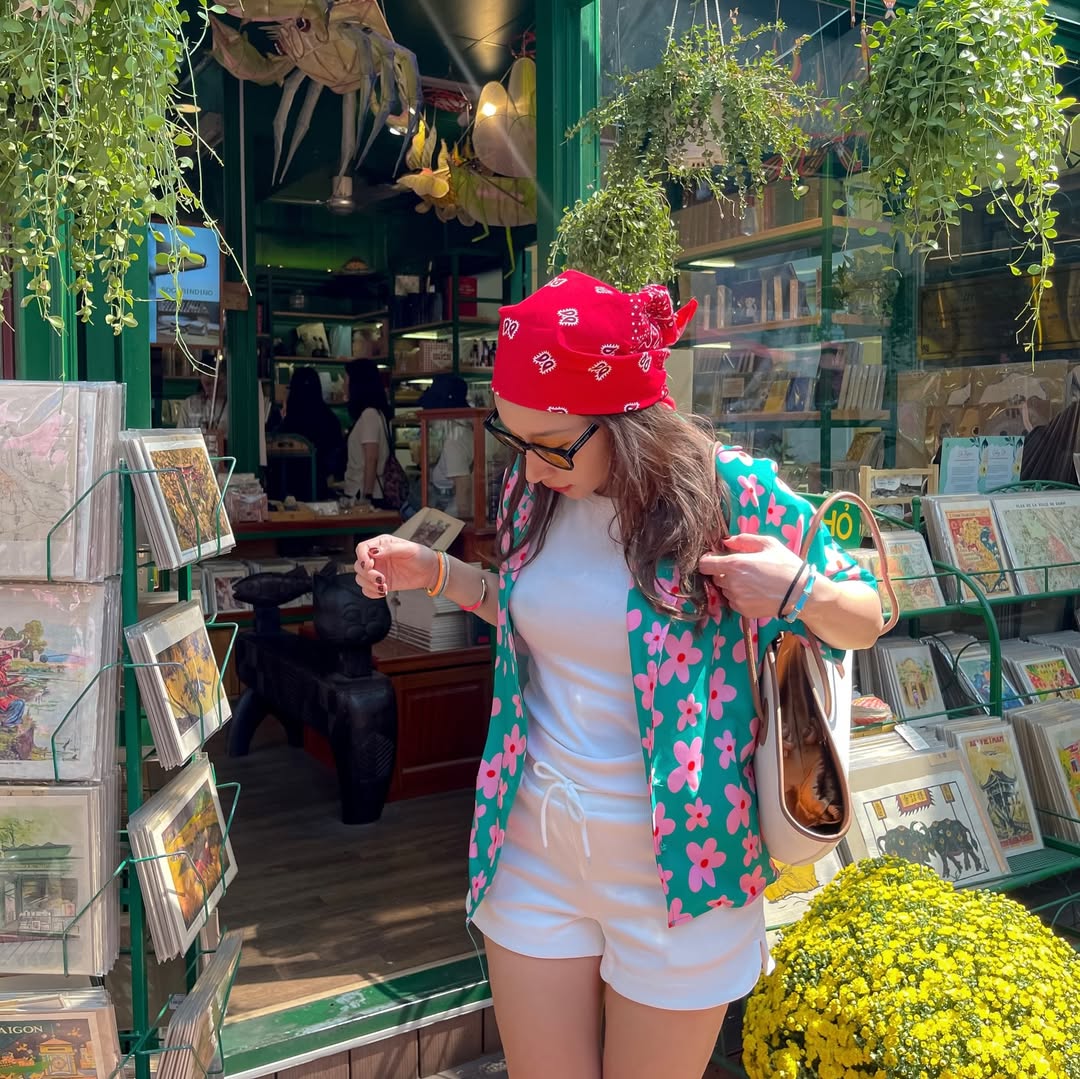 7. Floral Green Kimono Jacket With White Shorts And Red Bandana
