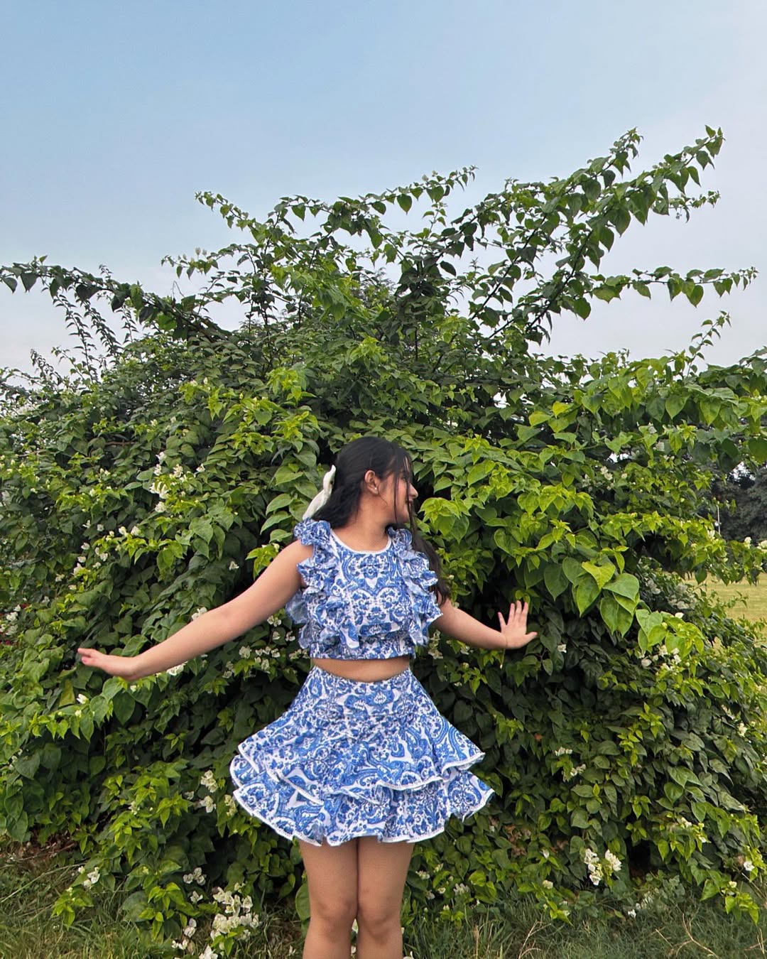 A stunning blue and white paisley print co-ord set featuring a ruffle sleeve crop top and a layered tiered mini skirt looks incredibly fresh and festive for summer. The bold baroque print feels Mediterranean and vibrant against lush green garden surroundings.