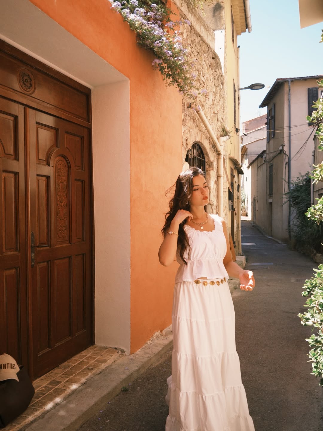 Worn against a sun-drenched cobblestone alley, this outfit radiates effortless European summer charm. Loose waves and minimal accessories let the graceful silhouette speak for itself on warm golden afternoons.