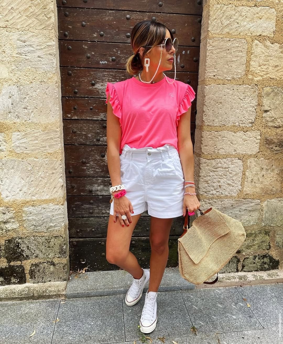 A vibrant neon pink ruffle sleeve t-shirt paired with crisp white tailored shorts brings energetic, playful summer color that truly stands out. The flutter sleeves add a feminine touch to an otherwise casual and sporty silhouette. A pearl chain sunglass cord doubles as a stylish accessory.