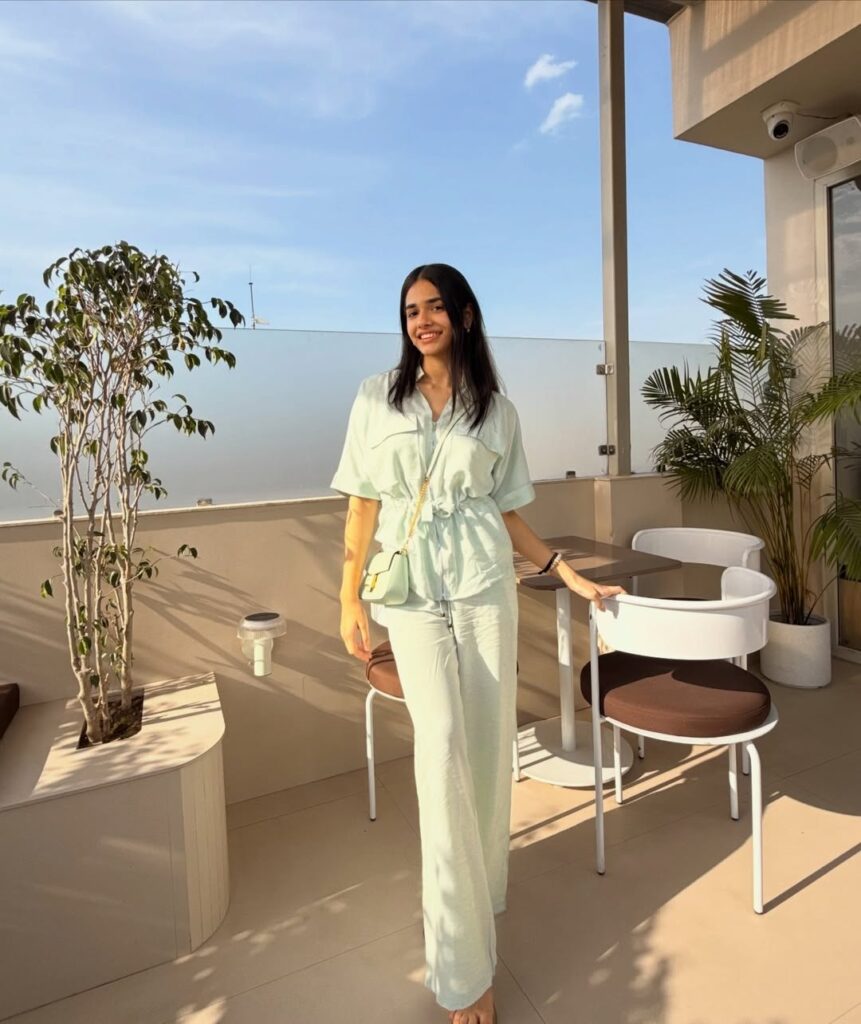 Small round tinted sunglasses and a structured cream leather saddle bag elevate the ensemble with understated sophistication. Surrounded by lush tropical greenery, this relaxed yet stylish warm-weather outfit radiates effortless South Asian-inspired summer fashion with genuine charm and personality.