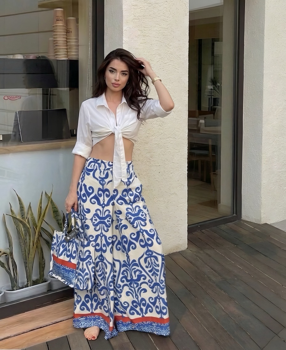 A classic white button-down shirt tied at the waist into a breezy crop style pairs stunningly with a bold blue and cream baroque print maxi skirt. The voluminous flowy skirt with red border trim carries strong Mediterranean tile-inspired energy that feels luxurious and vacation-ready.