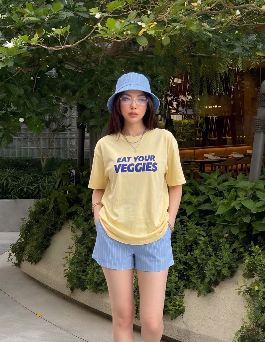 A cheerful yellow oversized graphic tee tucked loosely into light blue pinstripe mini shorts creates a fun, easygoing summer look full of playful personality. The bold navy blue slogan print adds humor and character that makes the outfit genuinely memorable and expressive.
