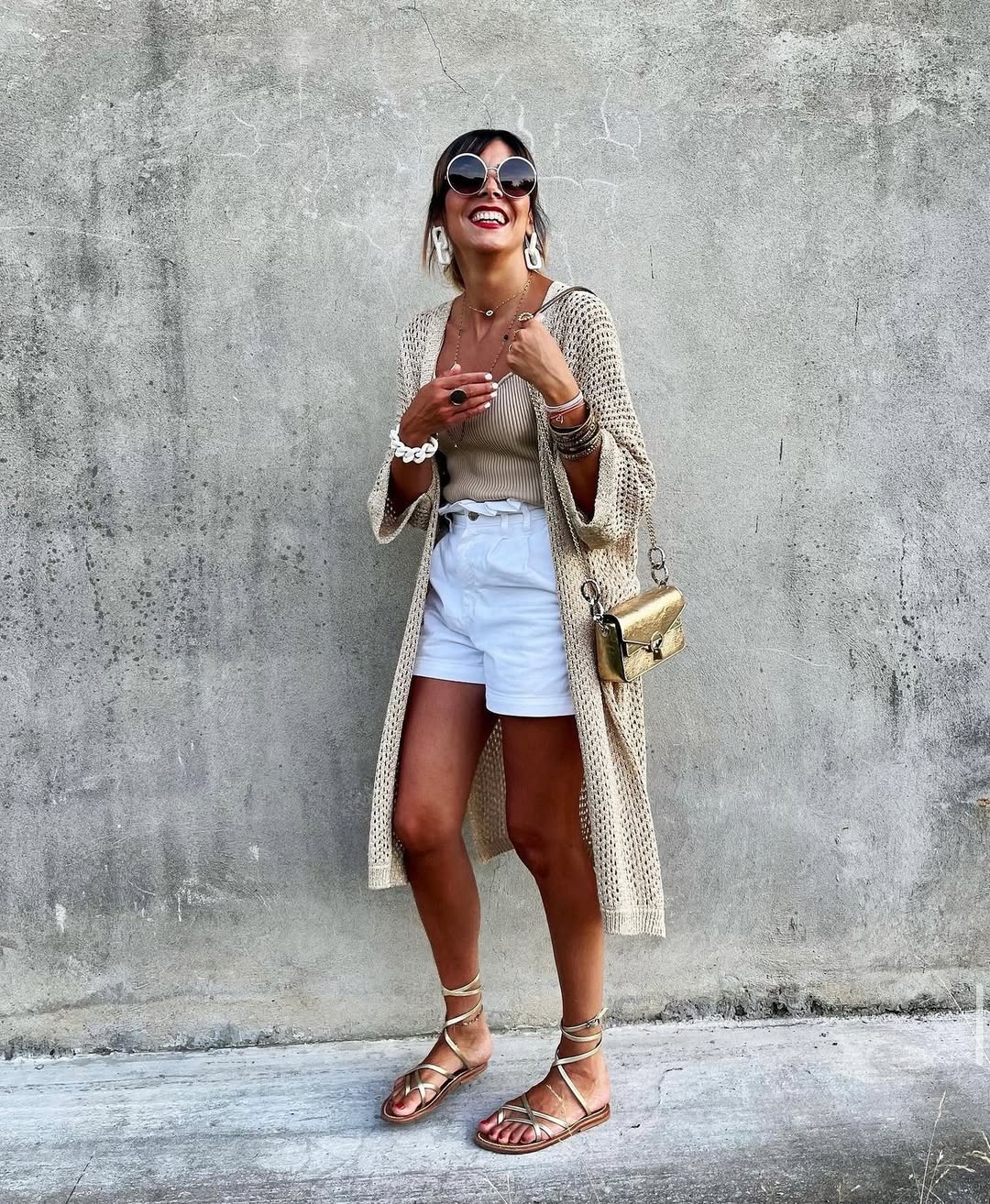 A fitted beige ribbed tank top paired with crisp white tailored shorts and a long open-weave knit cardigan creates a relaxed yet polished neutral summer look. Layered gold necklaces and stacked bracelets add rich texture and warmth to the tonal beige palette beautifully.