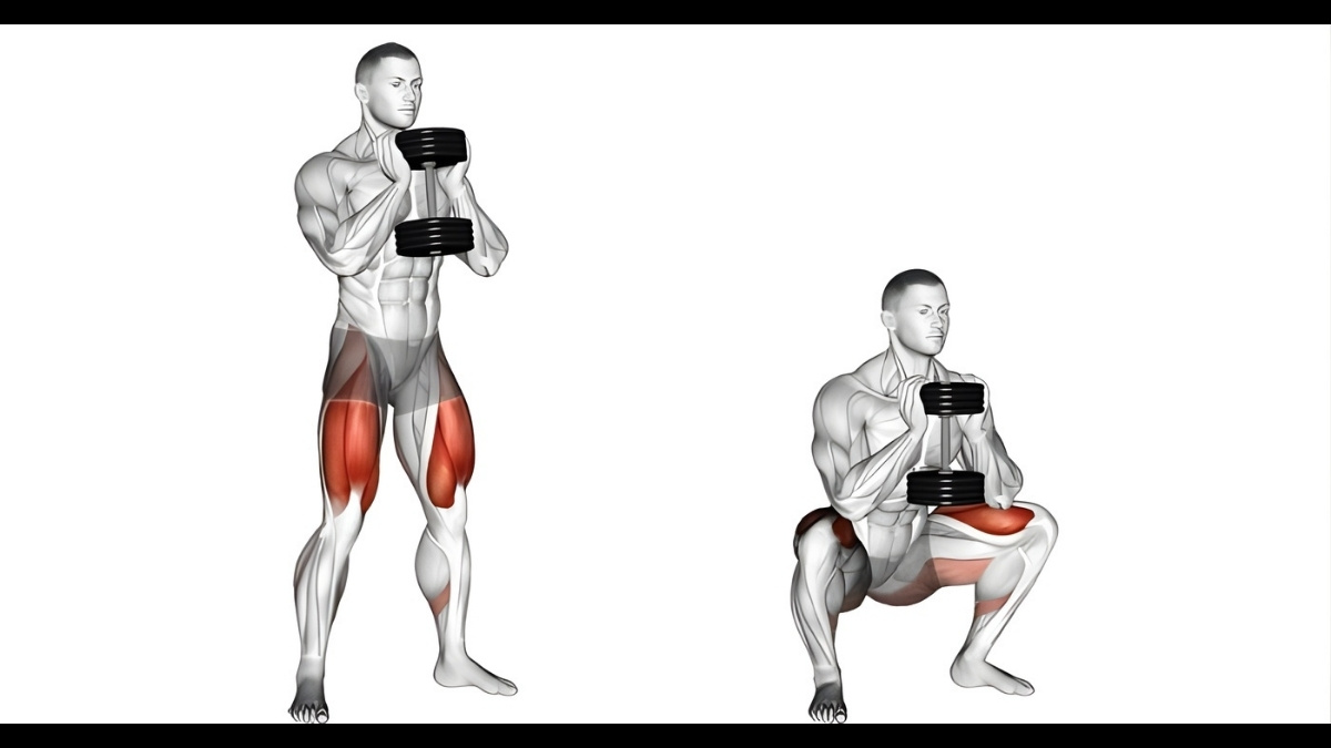 The goblet squat strengthens your calves, quads, hamstrings, glutes, lower back, and core. One exercise trains nearly your entire lower body while reinforcing good posture and balance.
