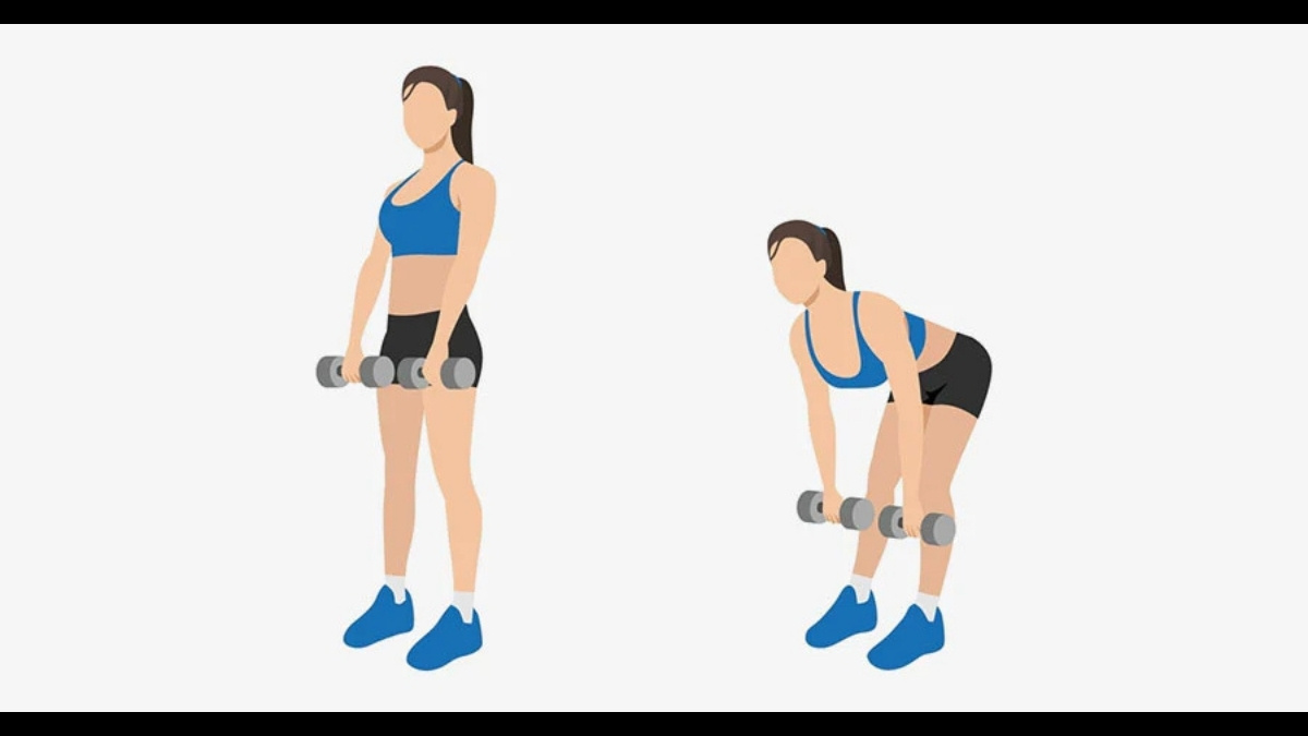 Stand with feet hip-width apart. Push your hips backward as if closing a car door with your hips. Keep your spine neutralânever rounded. Your shoulders stay above your hips. Hold a light weight with straight arms. Drive through your heels and stand tall.
