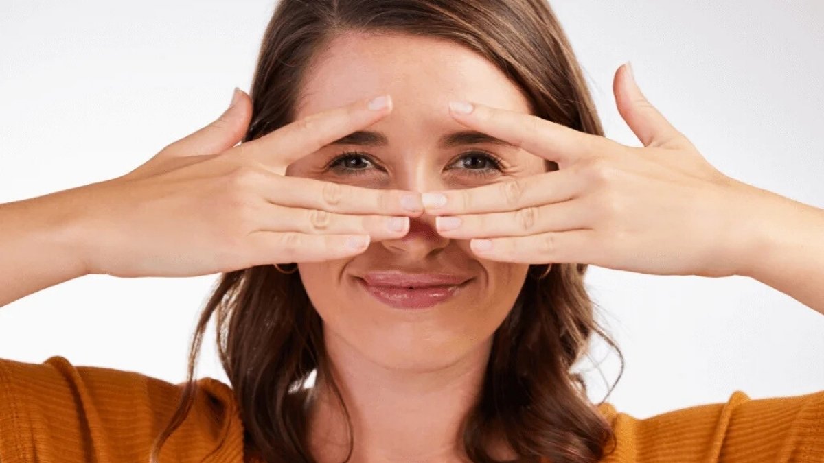 Place your middle fingers near the inner corners of your eyes, right along the sides of the uppermost part of your nose. Place your index fingers just outside the outer corners of your eyes. Your fingers create anchors.