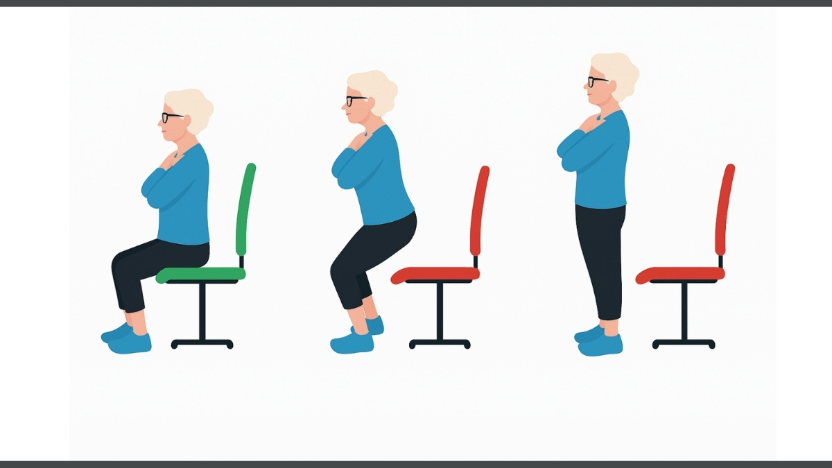 Sit in a sturdy chair with feet flat on the floor. Cross your arms over your chest. Lean forward a little. Push through your heels to stand up. Stand tall for a moment. Then lower yourself back down slowly. That slow part builds strength. Repeat 5 to 10 times.