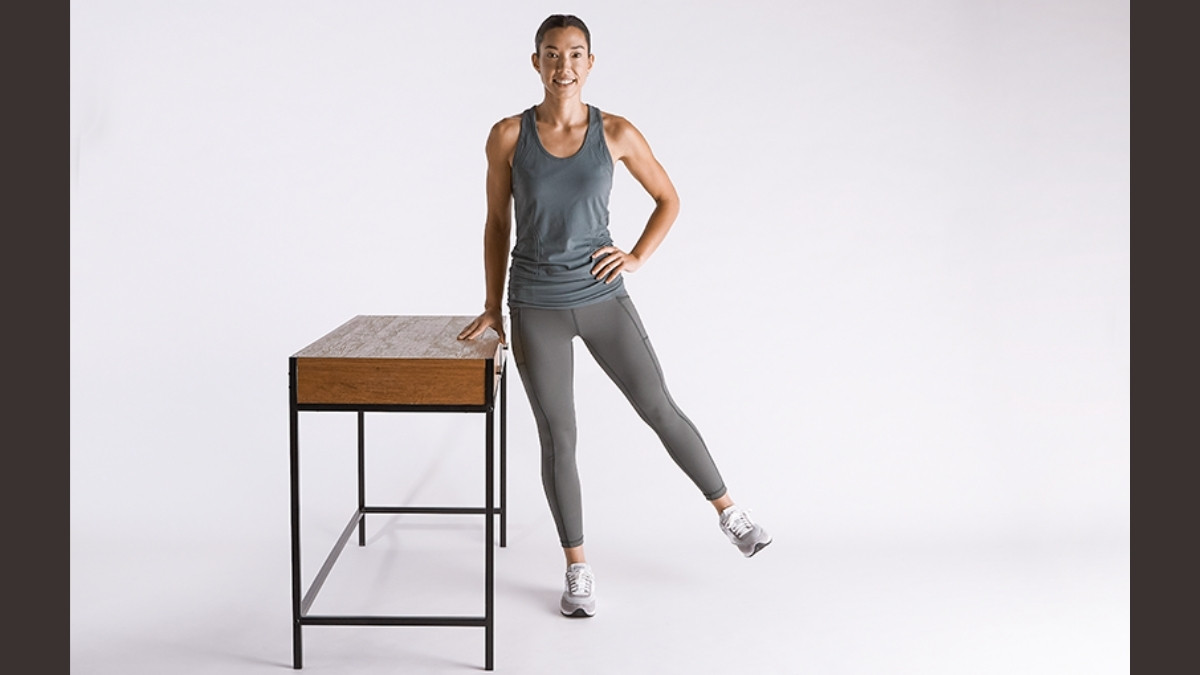 Stand behind a sturdy chair and hold the back. Lift your right foot off the floor. Hold for 5 to 10 seconds. Lower your leg with control. Switch sides. Do 5 reps on each leg.