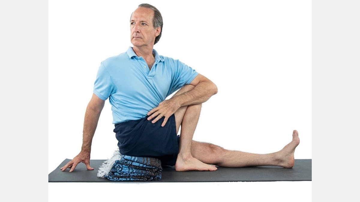 Now add the seated spinal twist. Sit upright. Place your left hand on your right knee. Slowly rotate your torso to the right. Look over your right shoulder. Hold for 20 to 30 seconds. Then switch sides.