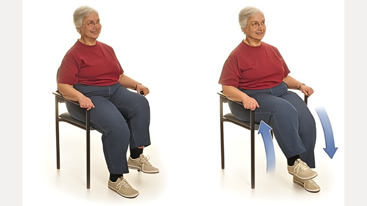 Knee lifts also engage your core. That core support is what keeps you stable the moment your feet hit the floor. This exercise is safe for seniors with arthritis, knee replacements, or limited mobility — the foot only rises a few inches.