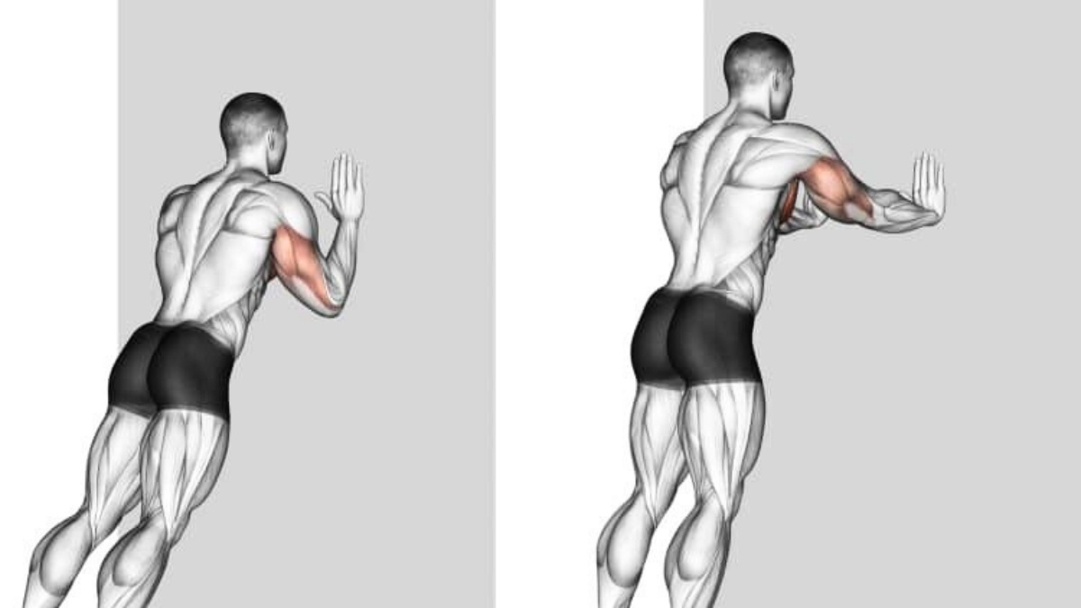 - Slowly bend your elbows, leaning your body toward the wall in a straight line.