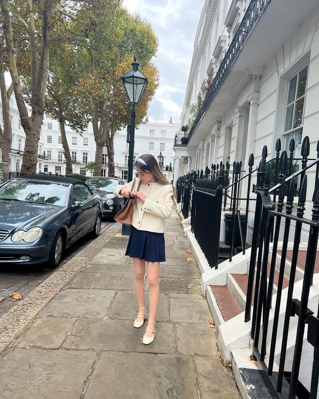 Patent leather flats with gold detailing add polished shine. Sleek sunglasses and a headband complete this elevated spring ensemble that radiates effortless European elegance.