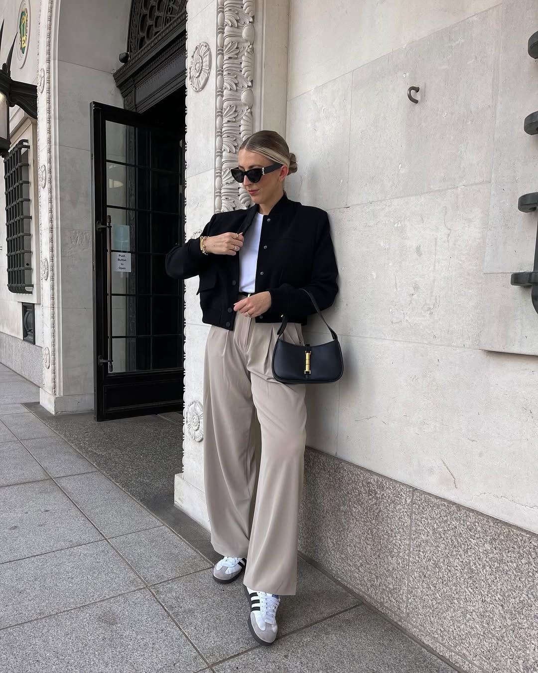 A crisp black bomber jacket pairs with tailored beige wide leg trousers for this sophisticated spring look. Clean white sneakers add sporty energy to the polished silhouette.