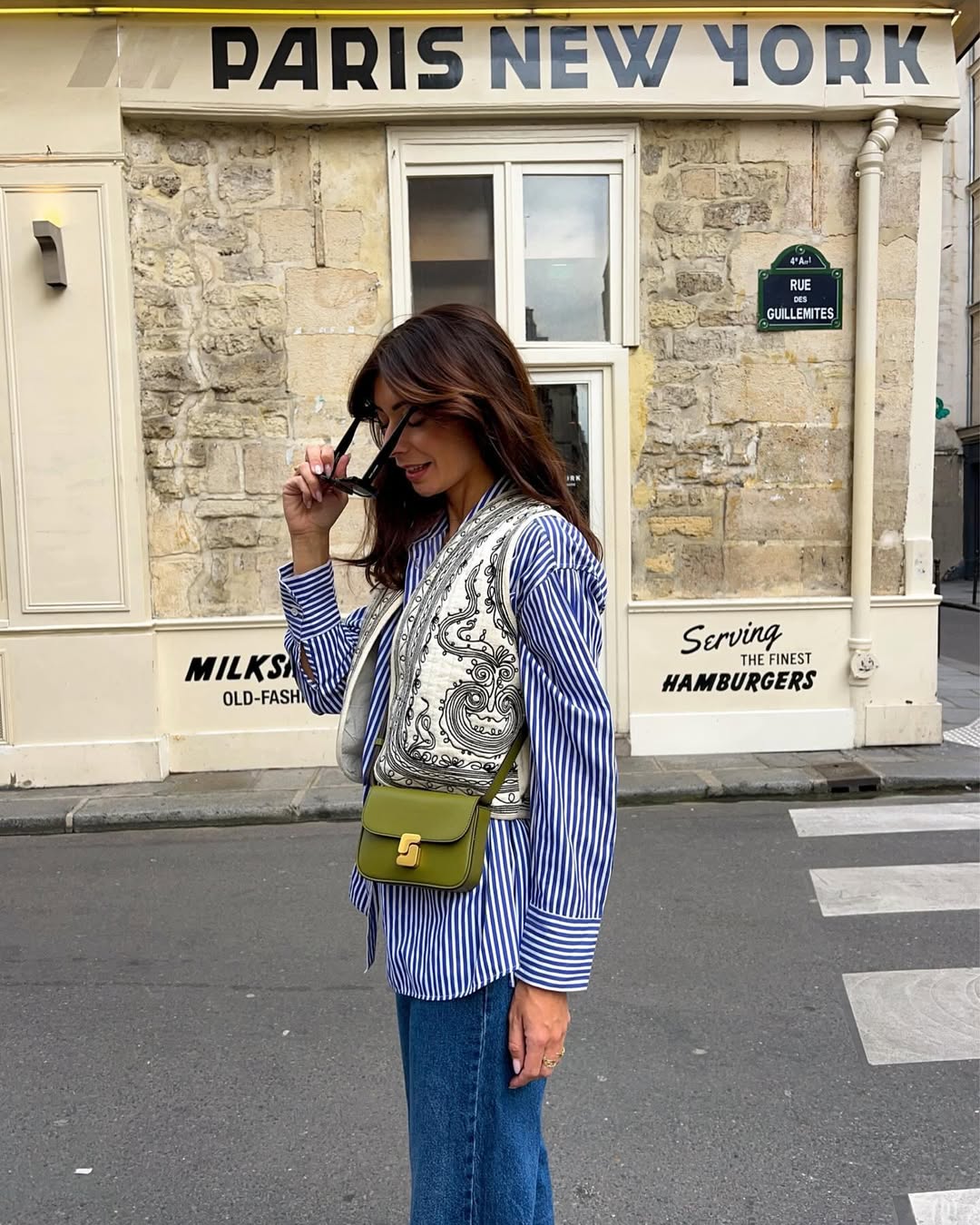An olive green crossbody bag adds unexpected color depth to the look. Paired with classic denim, this ensemble shows how mixing prints and textures brings dopamine dressing energy beyond solid colors.