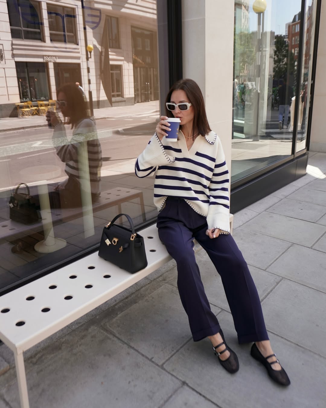 A timeless navy and white striped sweater brings nautical charm to tailored navy trousers. The crisp color contrast creates visual interest while maintaining elegant simplicity for spring mornings.