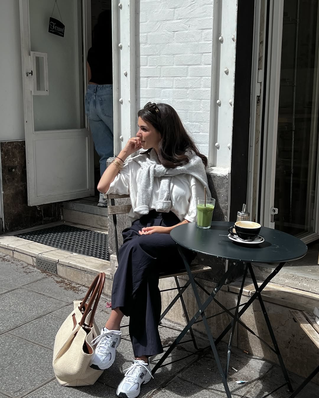 Chunky white sneakers add sporty contrast while a woven tote brings natural texture. This effortless combination works for casual brunches and sidewalk cafe moments with friends.