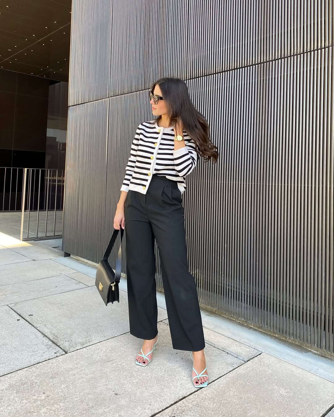 A graphic black and white striped cardigan brings nautical energy to sleek black wide leg trousers. The high contrast pattern creates visual excitement that energizes your mood instantly.