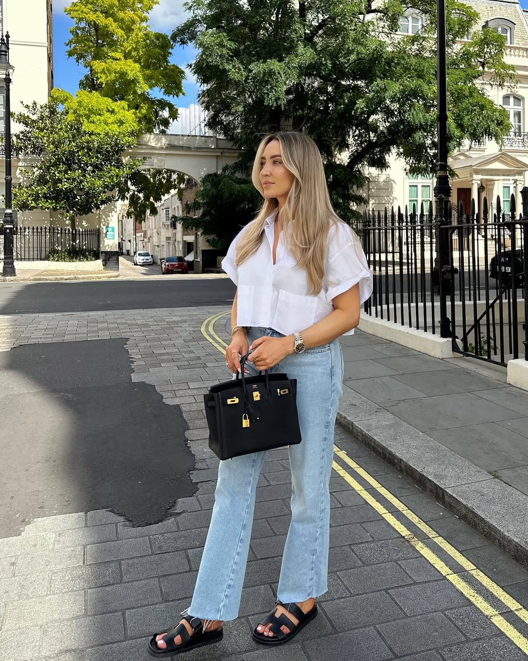 Black leather sandals and a designer handbag add polished touches. A gold watch and belt buckle bring subtle luxe details to this minimalist ensemble that radiates quiet confidence.