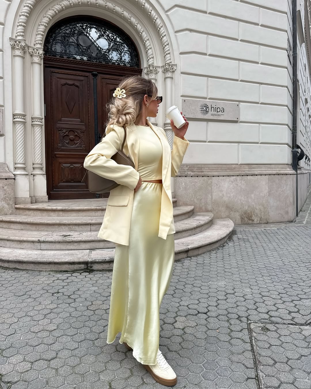 This luminous butter yellow satin dress embodies dopamine dressing at its finest. The silky fabric catches spring light beautifully while the matching blazer adds sophisticated structure.