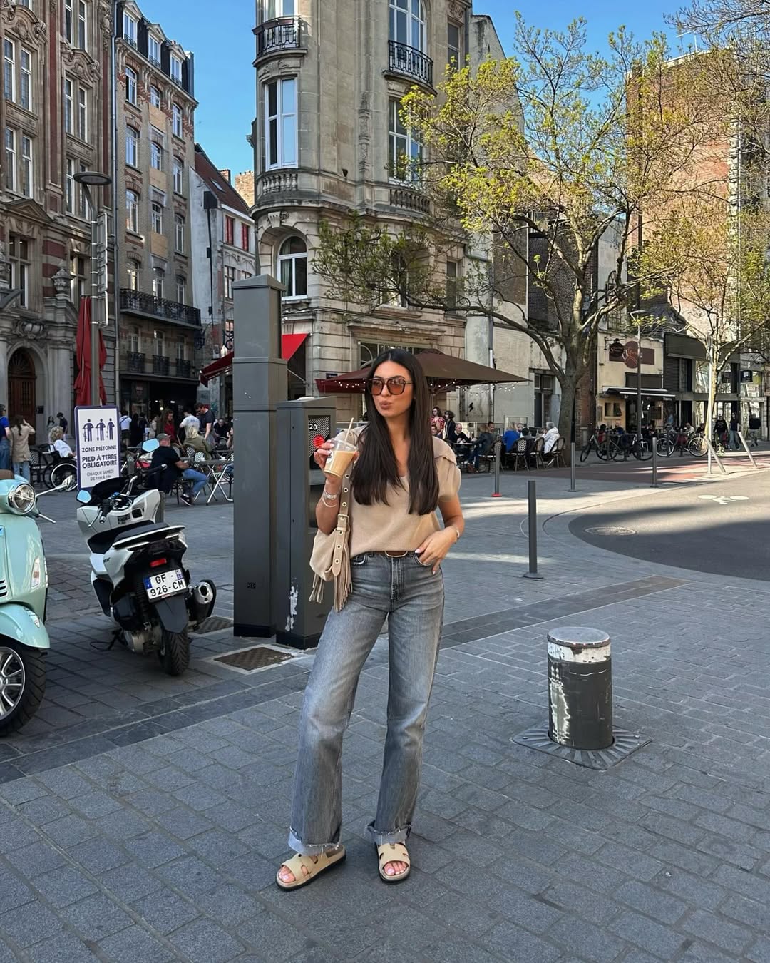 Cream Birkenstock sandals add laid back European charm. A fringe crossbody bag brings playful texture to this effortlessly chic outfit made for sunny afternoons wandering cobblestone streets.