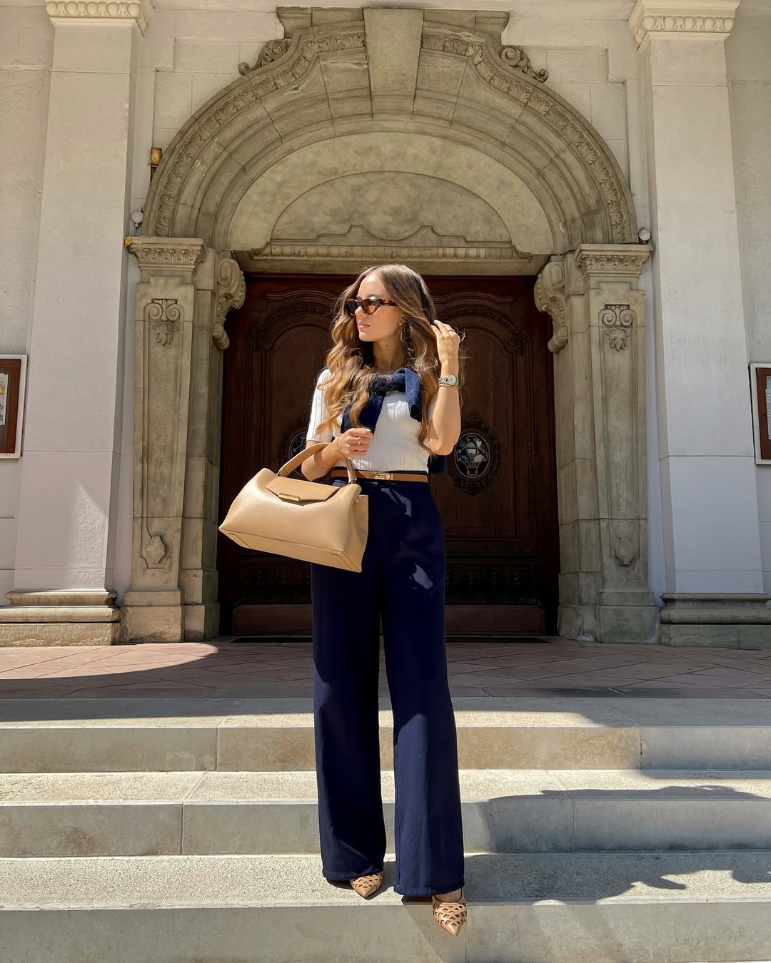 A crisp white sleeveless top tucks into flowing navy wide leg trousers for this sophisticated spring ensemble. A matching navy cardigan draped over the shoulders adds layers and European elegance.