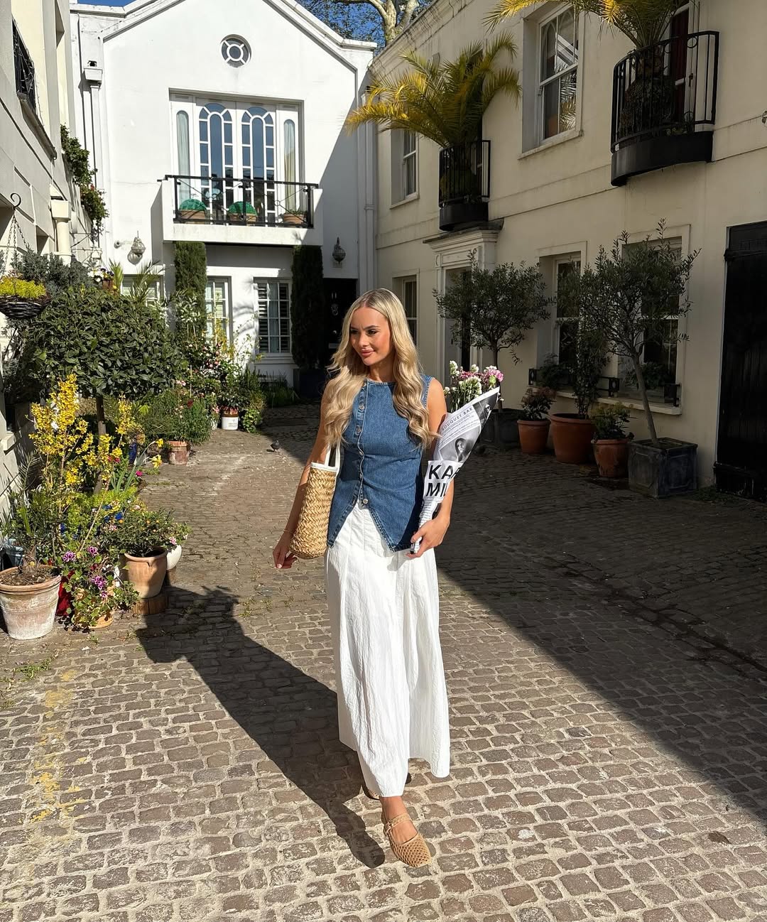 Woven tan mules and a basket tote filled with fresh blooms complete the countryside aesthetic. This effortless combination delivers dopamine through natural textures and airy fabrics that celebrate warm weather living.