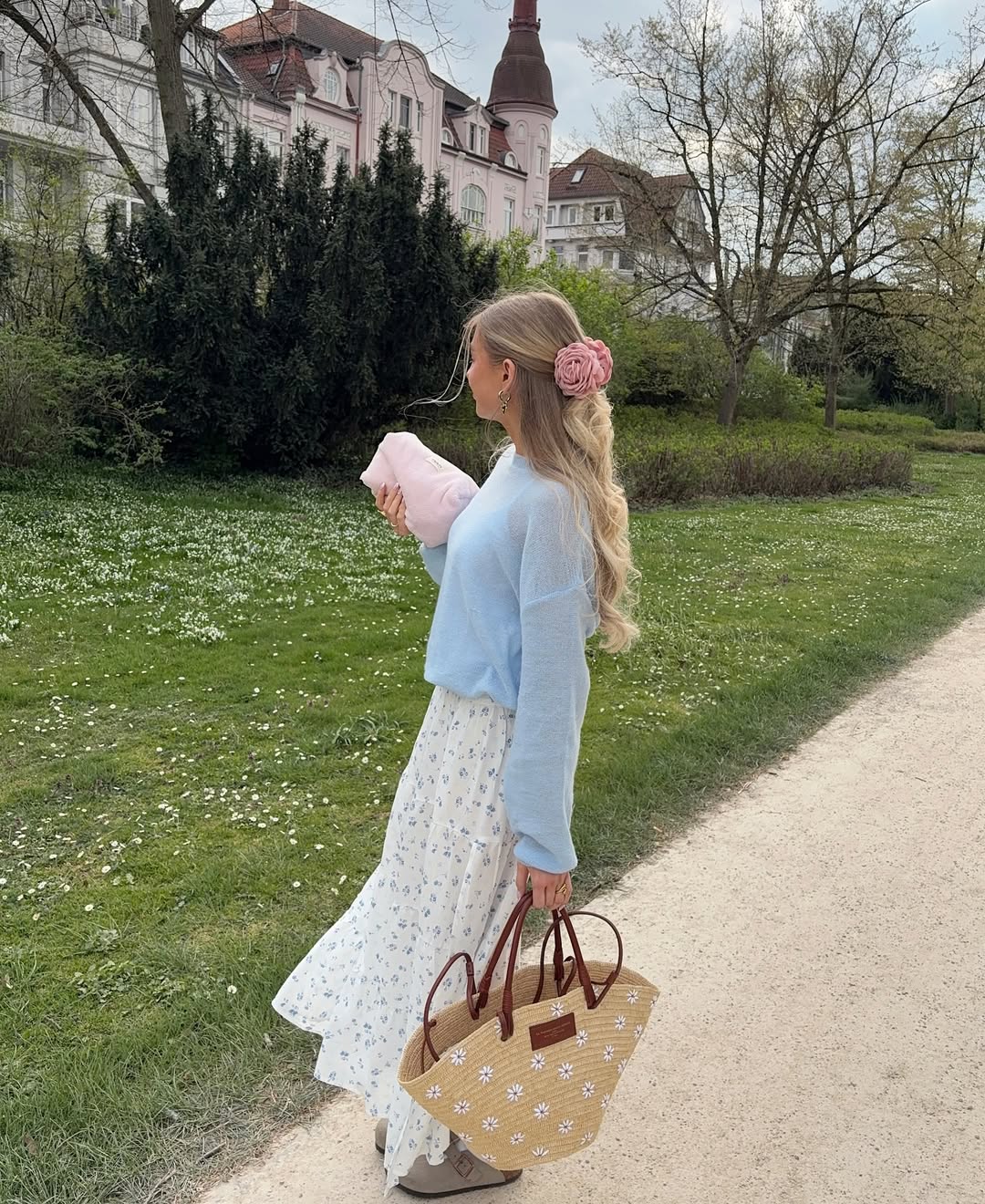 Soft baby blue knit pairs beautifully with a delicate floral midi skirt in this uplifting spring combination. The fuzzy texture creates instant comfort while pastel florals add feminine charm.