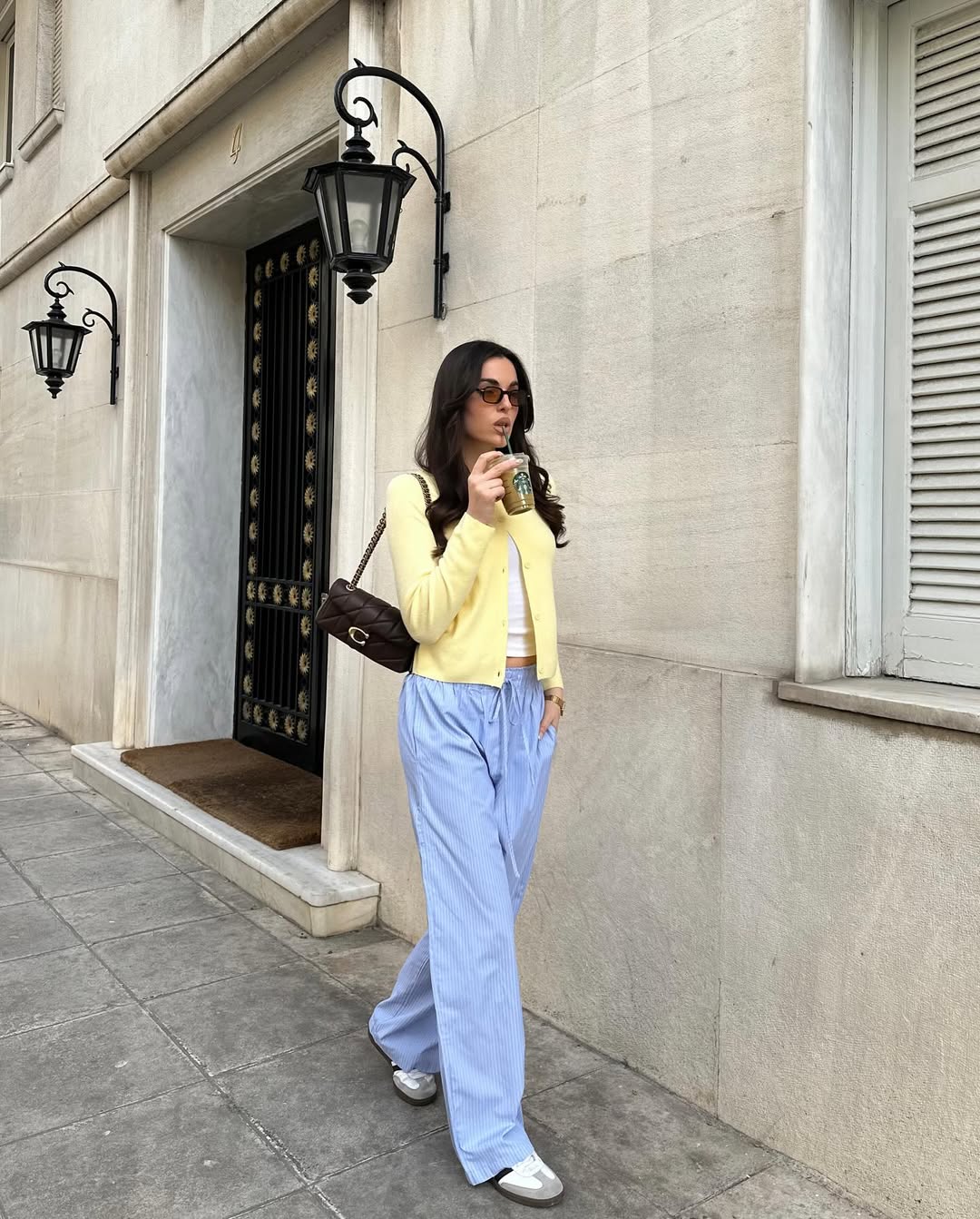 A sunny lemon yellow cropped cardigan brings instant happiness paired with soft blue pinstriped wide leg trousers. The cheerful color blocking creates dopamine through pastel combinations that feel fresh and optimistic.