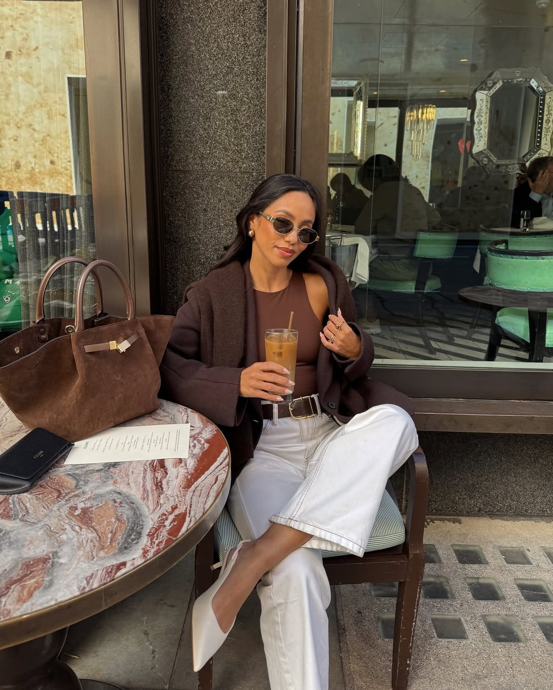 A luxe suede tote in matching brown tones completes the monochromatic palette. Oval sunglasses and a gold belt add refined details to this mood elevating ensemble that proves earthy tones bring dopamine too.