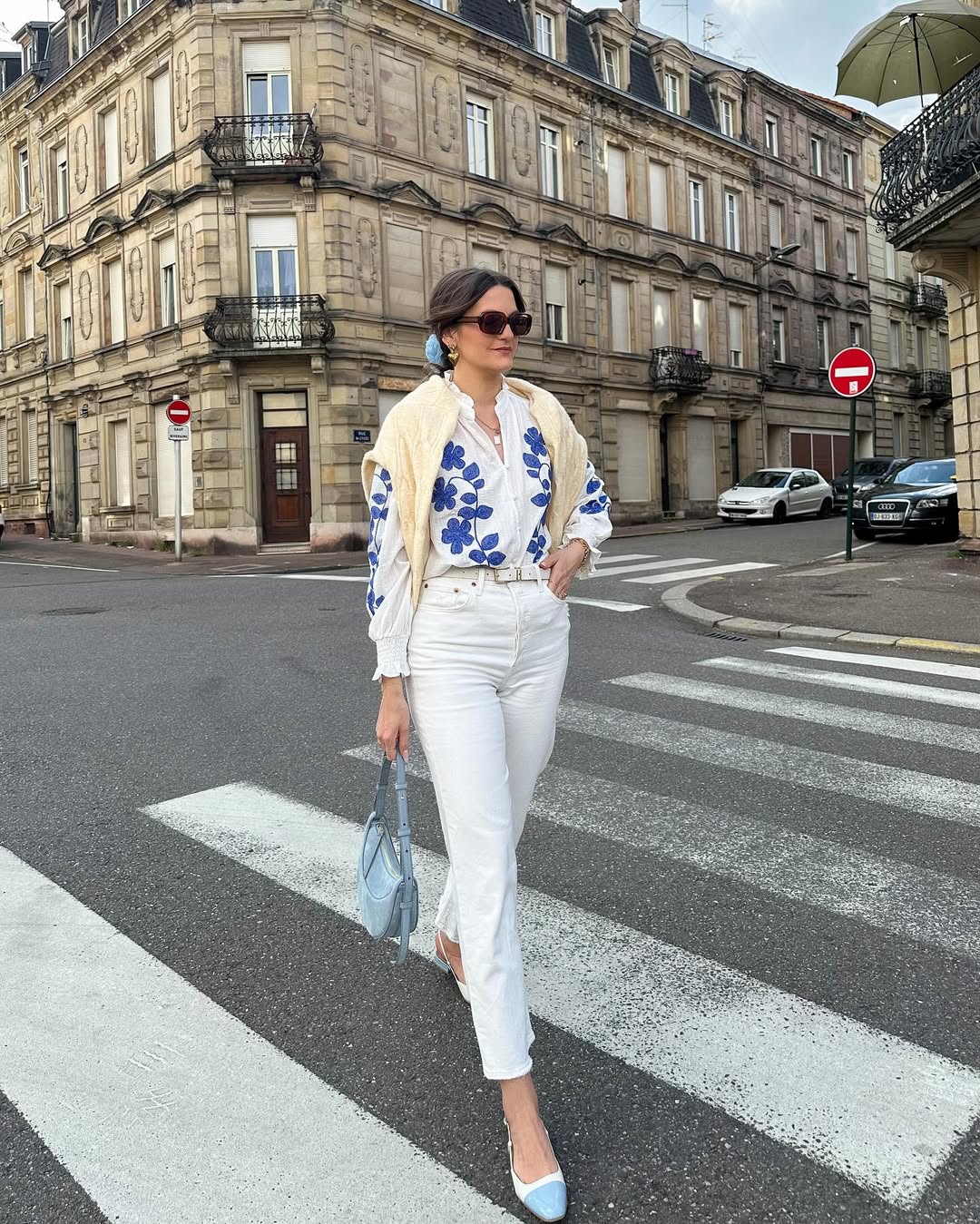 A white blouse featuring cheerful blue floral embroidery brings Mediterranean charm to crisp white jeans. A soft yellow cardigan draped casually adds warmth to the fresh spring palette.