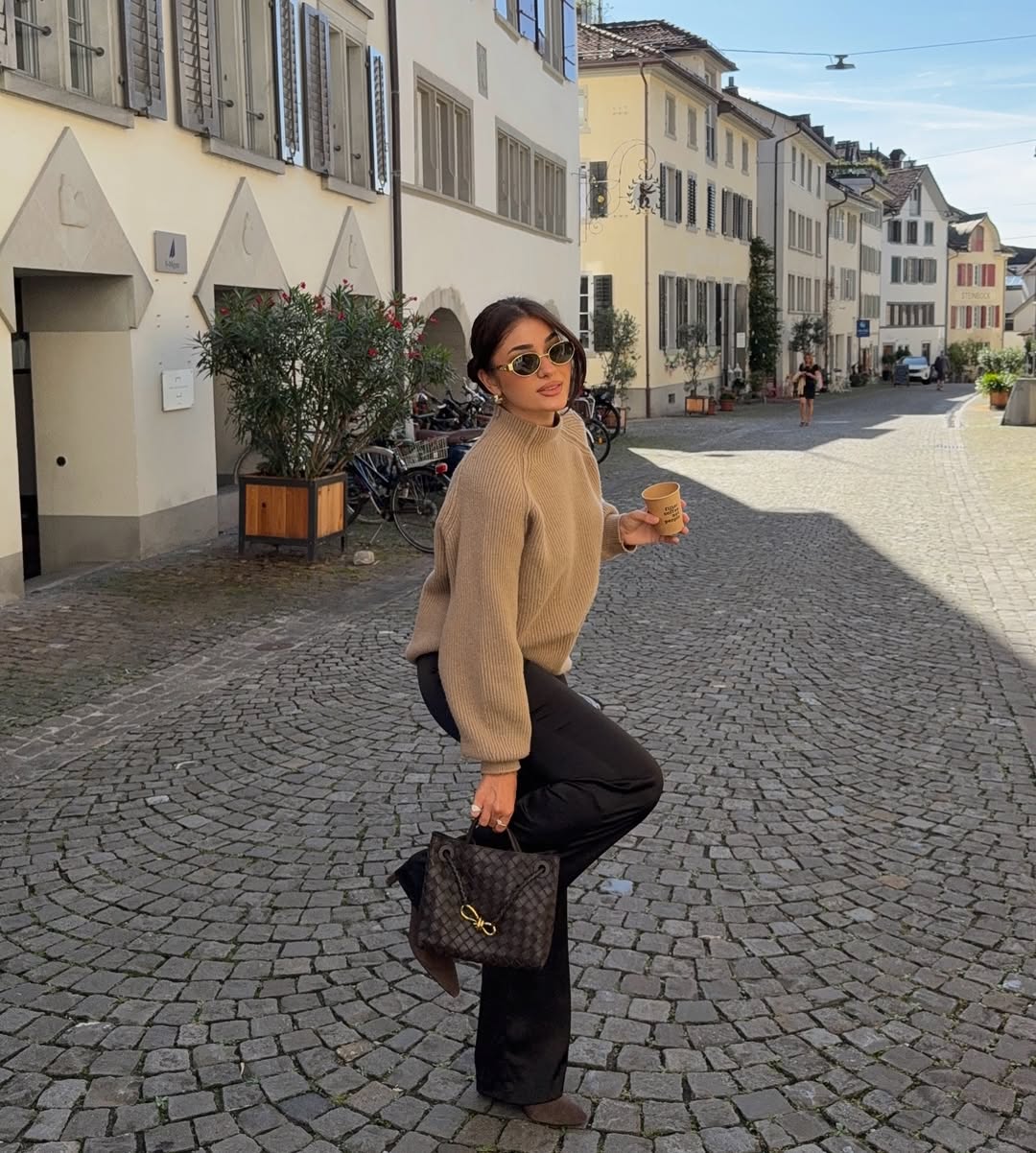 18. Camel Knit Sweater with Black Wide Leg Trousers