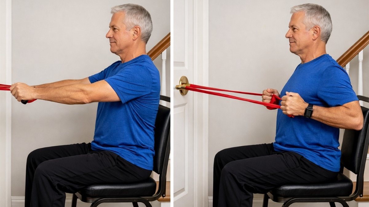 What It Is: Sit in a sturdy chair. Loop a resistance band around something fixed at waist height — a door handle, a stair railing, or a bedpost. Hold one end of the band in each hand. Start with your arms extended straight in front of you.