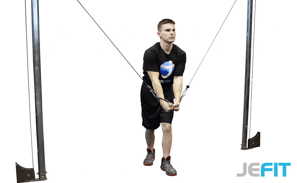 Set cable handles at chest height. Step forward. Arms slightly bent. Pull handles together in front of your chest. Squeeze hard for one second. Return slowly.