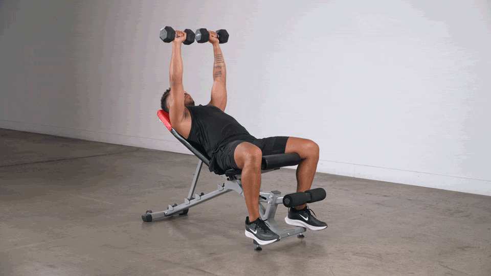 Sit on an incline bench (or adjustable chair). Hold 10-15 pound dumbbells. Press up but stop before your elbows lock. Lower slowly. Feel your chest stretch.
