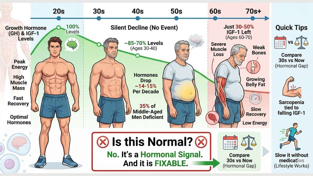 The numbers are clear. Growth hormone drops by about 14 to 15 percent every decade. By the time you are 60 to 70 years old, your IGF-1 may be just 30 to 50 percent of what it was in your twenties. Research also found that 35 percent of middle-aged men are GH deficient — and most do not know it.