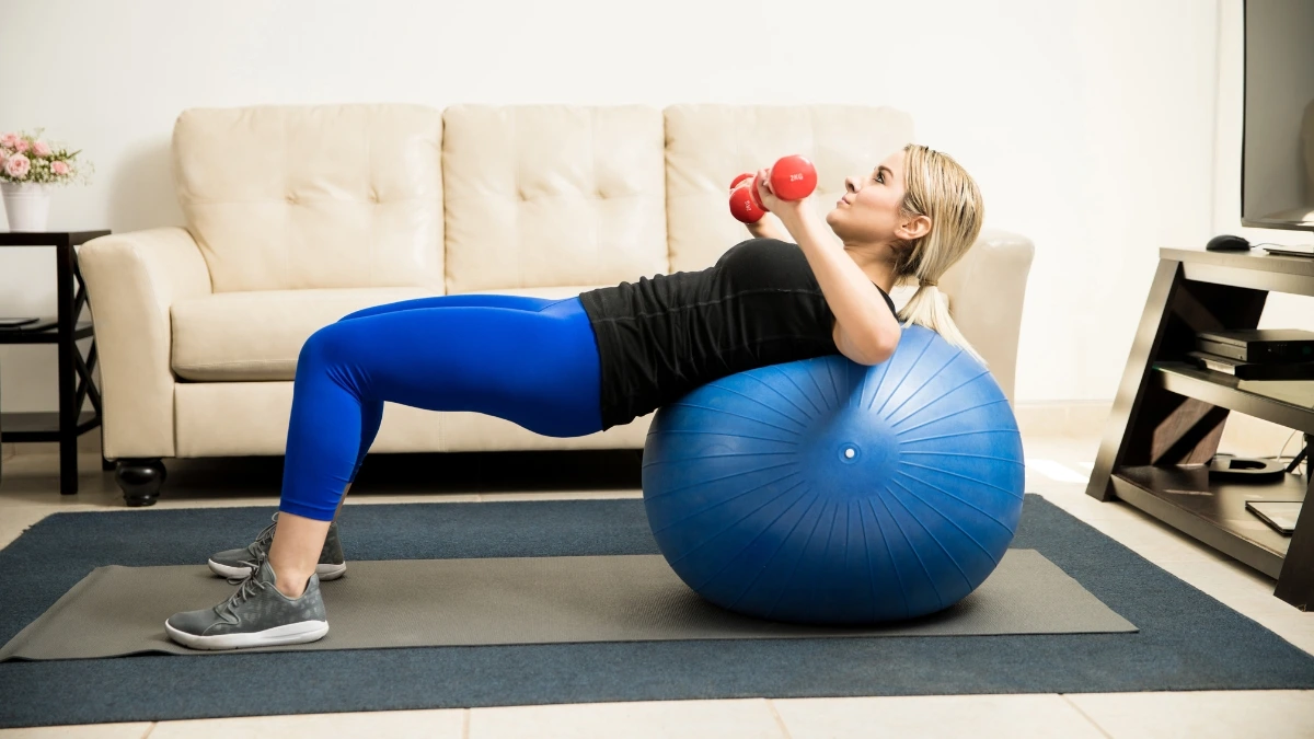 Try bicep curls while sitting in a chair. Do chest presses lying on your stability ball. Overhead presses work better standing against a wall for support.