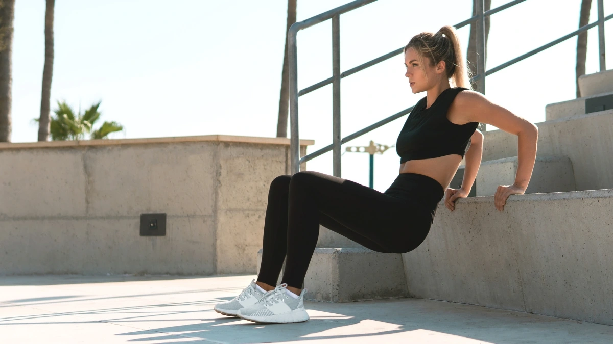 This classic bodyweight exercise targets the back of your arms while also engaging your shoulders and chest, using a bench or chair for support.