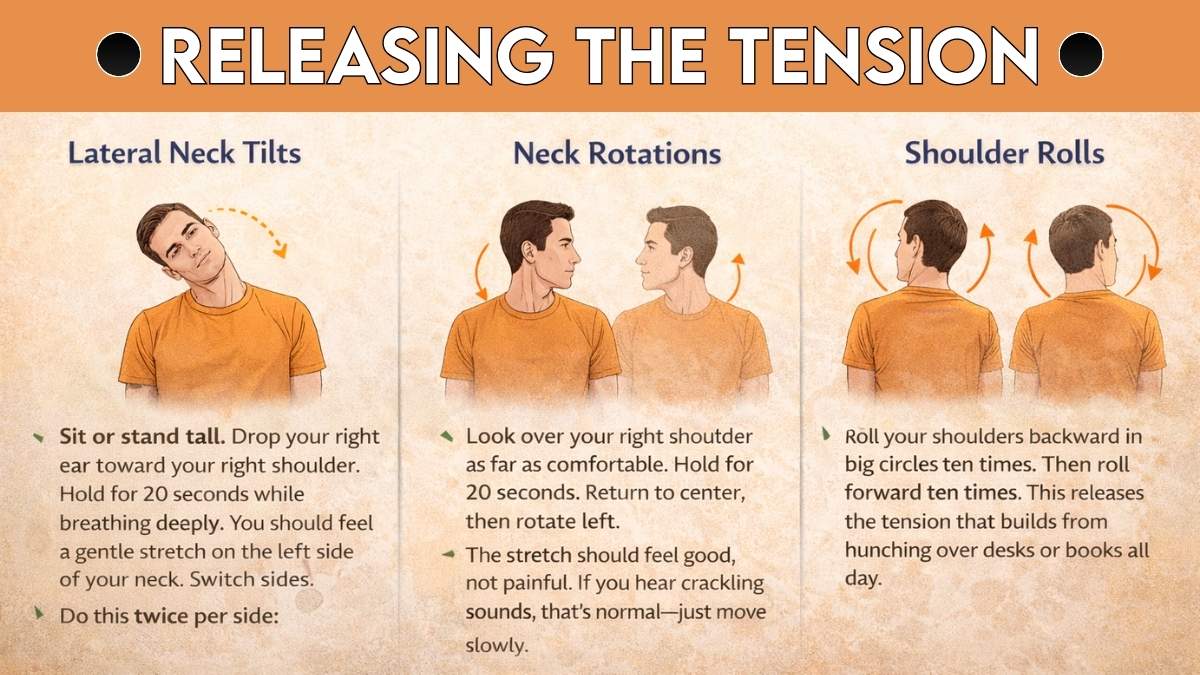 Your neck and shoulders hold every worry from the day. Every email you read, every bill you paid, every time you looked down at your phone—it all collects right here. We start at the top because releasing this tension first makes everything else easier.