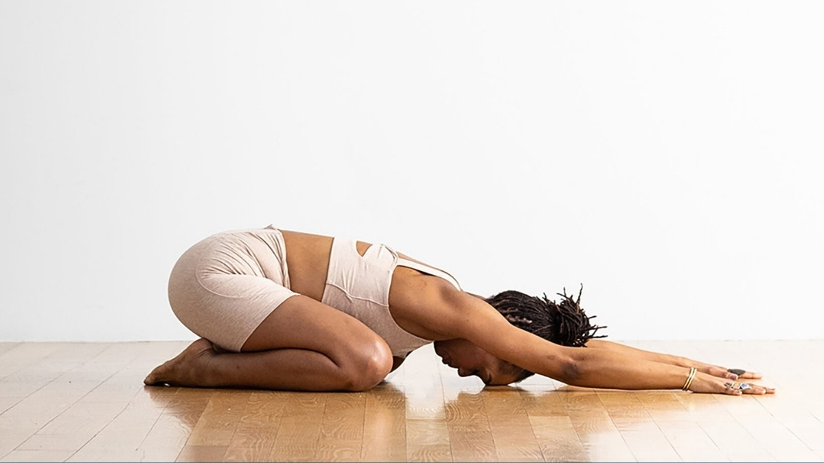 Kneel on the floor and sit back on your heels. Fold forward with your forehead resting on the floor (or a pillow). Extend your arms forward or rest them by your sides. This releases tension in your back, shoulders, and neck. If kneeling hurts, do a seated forward fold in a chair instead.