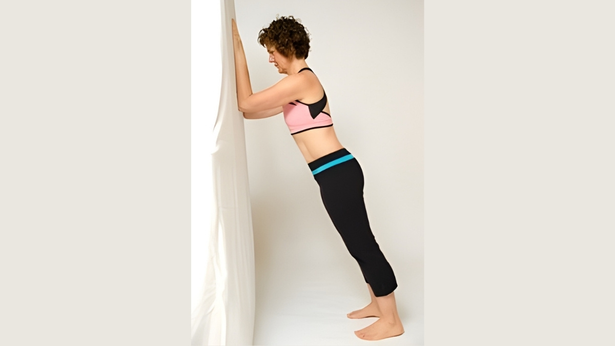 I do wall planks because floor exercises hurt my knees. Place your hands on a wall at shoulder height. Walk your feet back until your body forms a straight line.