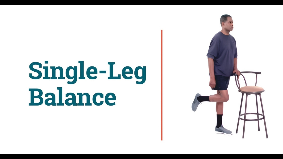 Start by holding the chair with both hands for 10 seconds. When that feels easy, use just one hand for 30 seconds. Eventually, let go completely and aim for 60 seconds. You can even try it with your arms crossed or eyes closed.