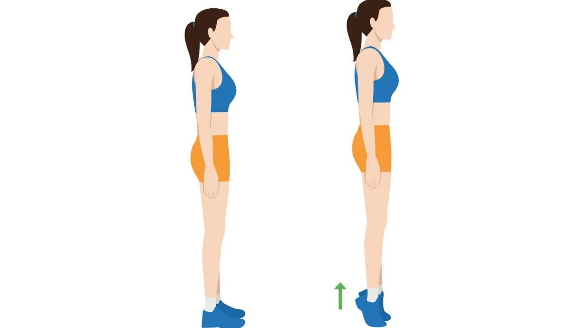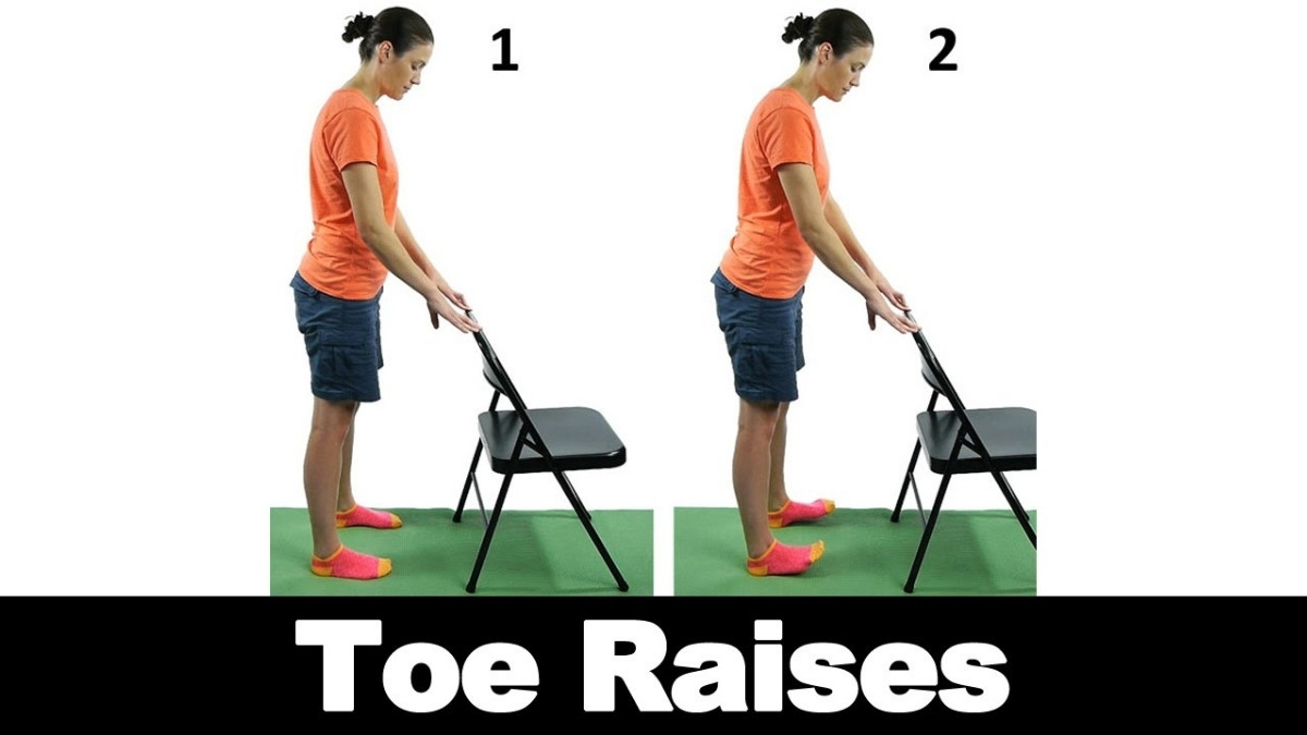 Stand behind a chair and hold it lightly for balance. Place your feet hip-width apart. Slowly lift your heels off the ground, rising onto the balls of your feet. Hold for 2-3 seconds at the top. Lower back down with control. Do 10-15 repetitions, rest, then repeat for 2-3 sets.