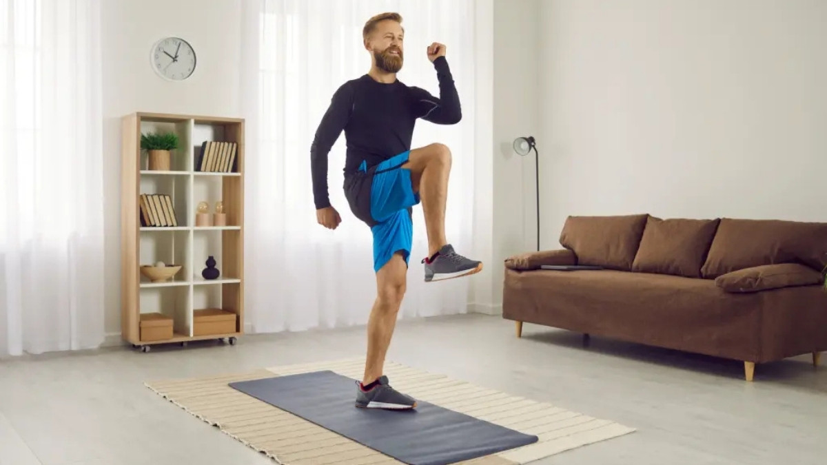 Stand with your feet hip-width apart. If you feel wobbly, keep one hand on a chair or counter. Lift one knee up toward your chest. Go as high as feels comfortable. Lower it back down. Now lift the other knee. Keep switching legs for 20 to 30 seconds. Your back stays straight. Your chest stays up.