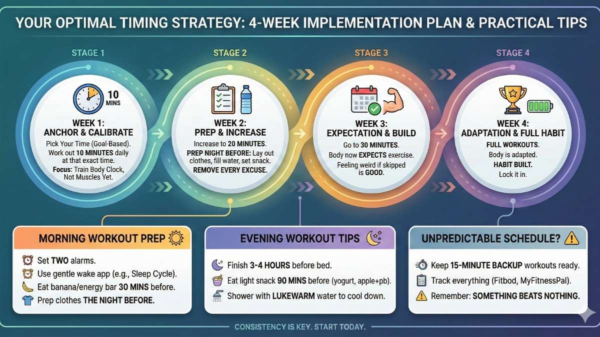 Your action plan: Track your workout times for one week. Notice your energy levels, performance, and how you feel afterward. Then experiment with your optimal window for 3-4 weeks—that’s how long it takes for your body clock to adapt. Remember: the best workout time is the one you’ll actually stick with.