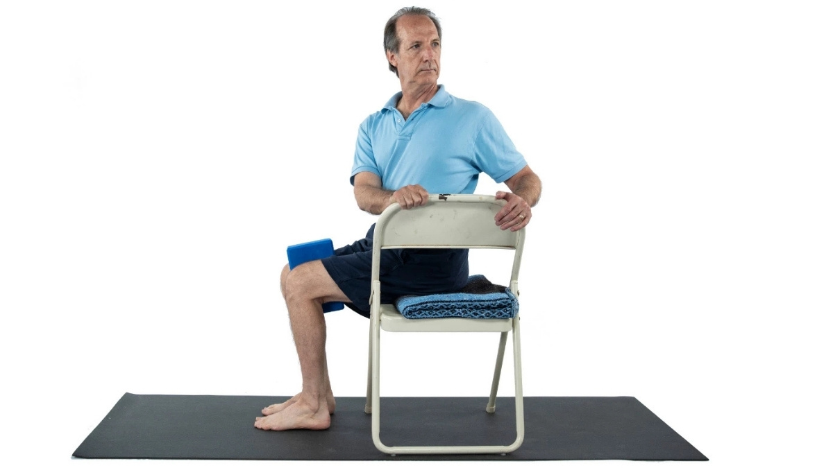 2. Place your left hand on your right knee and your right hand on the side of the chair.