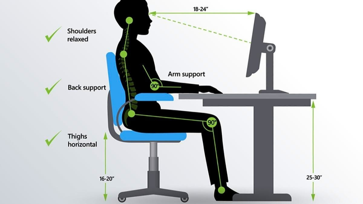 Sit up in your chair. Plant both feet flat on the floor. Let your shoulders drop and relax. Look straight ahead at your screen—not up, not down, just level.